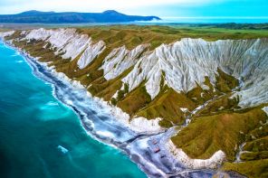 На фото: белые скалы на острове в заливе Простор, Сахалинская область, Курильские острова, остров Итуруп, Россия.