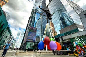 На фото: арт-объект «Why people can’t fly» («Почему люди не могут летать») художника Василия Клюкина, установленный в Деловом центре, Москва, Россия.