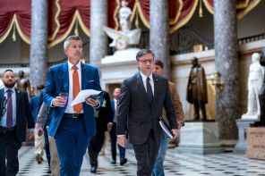 На фото: министр транспорта Шон Даффи (слева) и спикер Палаты представителей Майк Джонсон, республиканец от Луизианы, идут через Скульптурный зал Капитолия на пресс-конференцию, посвященную 23-му дню приостановки работы правительства, в Вашингтоне.