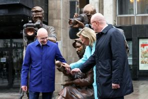 На фото: генеральный директор ТАСС Андрей Кондрашов, официальный представитель МИД РФ Мария Захарова и вице-премьер РФ Дмитрий Чернышенко (слева направо) на открытии скульптурной композиции «Журналисты России» в сквере у здания информационного агентства ТАСС на Тверском бульваре. Автор композиции — скульптор Владимир Иванов.