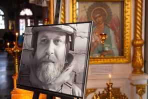 На фото: портрет погибшего в Запорожье военного корреспондента МИА «Россия сегодня» Ивана Зуева во время отпевания, Тюмень, Россия.