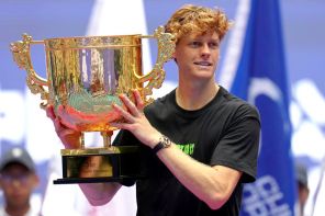 На фото: итальянский теннисист Янник Синнер после победы в финальном матче турнира Ассоциации теннисистов-профессионалов (ATP) против Лёнера Тьена из США, Пекин, Китай.