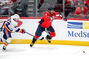 На фото: левый нападающий «Вашингтон Кэпиталз» Алекс Овечкин (8) борется за шайбу с центровым «Нью-Йорк Айлендерс» Жаном-Габриэлем Пажо (44). Чемпионат НХЛ: «Вашингтон Кэпиталз» — «Нью-Йорк Айлендерс» — 1:3.