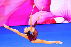 На фото: Анастасия Власенко (Москва) во время соревнований. Дворец художественной гимнастики Ирины Винер. Международный турнир по художественной гимнастике «Кубок сильнейших». Финал. Сениорки. Индивидуальная программа. Многоборье.