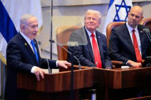 На фото: премьер-министр Израиля Биньямин Нетаньяху, президент США Дональд Трамп и спикер парламента Израиля Амир Охана (слева направо) в парламенте Израиля.