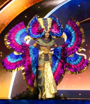 На фото: костюм Мисс Египет Сабрины Магед был вдохновлен Нефтидой, египетской богиней ночи и защиты. Магед шла по сцене конкурса «Мисс Вселенная» в мерцающем золотом платье, достойном королевы — или богини. Её наряд украшали яркие фиолетовые, синие и золотые крылья Нефтиды. Согласно аккаунту в соцсети Мисс Египет, Нефтис — «воплощение женщины, способной преобразовать горе, борьбу и тьму в цель — истинные ценности Мисс Вселенная». 23-летняя Магед работала моделью в Азии и арабском мире.