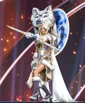 На фото: национальный костюм «Мисс Эстония» Бригитты Шабак был создан по мотивам знаменитой эстонской пьесы 1912 года. «Libahunt» рассказывает историю молодой женщины, которую обвиняют в том, что она оборотень, потому что она отличается от других, но она отказывается соответствовать ожиданиям общества, по словам участницы Мисс Вселенная. Шабак воплотила образ знаменитой героини в своём ансамбле, состоящем из платья на меховой подкладке, сапог и большой волчьей головы, которую она носила вместо шляпы. Костюм она дополнила мечом, гордо пронеся его по сцене. 28-летняя королева конкурса красоты была профессиональной моделью в Нью-Йорке, прежде чем вернуться в Эстонию, чтобы изучать информатику.