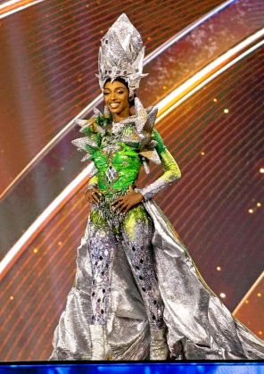 На фото: Мисс Гвинея Тигиданкэ Берете отдала дань уважения горнодобывающему проекту на своей родине, надев блестящий костюм. 24-летняя Берете отдала дань уважения «Симанду 2040» — масштабной горнодобывающей инициативе в Гвинее — в своем ансамбле, состоящем из блестящего комбинезона и серебряного головного убора, напоминающего гору. Весь наряд был усыпан серебристыми блестками, а зелёные детали на лифе придавали образу земной оттенок. Берете изучает моду в Милане и выступает за новые формы поддержки женщин, страдающих послеродовой депрессией.