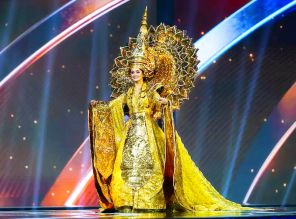 На фото: Мисс Индия Маника Вишвакарма была в золоте на конкурсе костюмов. Своим костюмом 22-летняя Вишвакарма отдала дань уважения моменту просветления Будды, которое произошло под деревом Бодхи. Золотое бальное платье конкурсантки с широкими рукавами и шлейфом искусно было расшито бисером, как и круглая спинка и заострённый головной убор. Вишвакарма совмещает учебу и работу моделью.