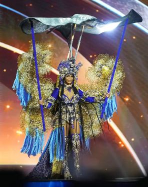 На фото: костюм мисс Каймановы острова Таити Муреа Сеймур был вдохновлен афро-карибским духом воды. Эффектный ансамбль Сеймур — дань уважения Йемайе, богине океана из религии йоруба, которая считается матерью океана. По словам Мисс Вселенная, Сеймур хотела, чтобы её костюм стал «призывом заботиться о коралловых рифах». Королева конкурса красоты была одета в сине-золотое боди с длинными рукавами и сапоги в тон. Центральным элементом её образа стали мерцающие золотые крылья на спине. 22-летняя Сеймур имеет высшее образование в области политики и международных отношений и планирует построить карьеру в сфере актерского мастерства и модельного бизнеса.