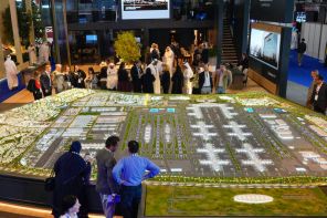 На фото: посетители собрались возле макета пятиполосного аэропорта стоимостью 35 миллиардов долларов в рамках проекта Международного аэропорта Аль-Мактум во время Дубайского авиасалона, Объединенные Арабские Эмираты.