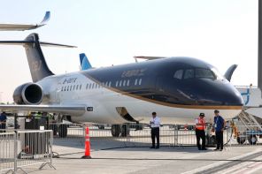 На фото: китайский реактивный самолёт C919 в международном аэропорту Аль-Мактум перед открытием международного авиасалона Dubai Airshow 2025.