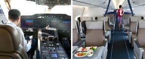 На фото: кабина пилота и пассажирские кресла китайского реактивного самолёта C919 перед открытием международного авиасалона Dubai Airshow 2025.