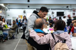 В качестве временного убежища используется крытое помещение, где некоторые перемещенные лица сидят или лежат на тонких матрасах, расстеленных на полу, в окружении своих личных вещей и коробок с едой.