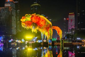 На фото: гигантский рыбный фонарь Аою взлетает во время церемонии открытия Международного фестиваля света в Гуанчжоу, провинция Гуандун, Китай.