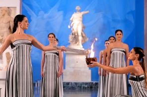 На фото: актриса Мэри Мина (слева) на церемонии зажжения олимпийского огня зимних Олимпийских играх 2026 года в Милане (Кортина), Древняя Олимпия, Греция.