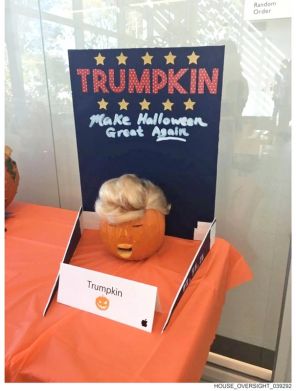 На снимках фигурирует и американский президент. На одном из них портрет Трампа изображен на пачках презервативов с надписью «I'm HUUUUGE!» («Я огромный!»), на установленной рядом табличке указана цена изделия в 4,5 доллара. На другой фотографии показана тыква с вырезанными прорезями вместо глаз, носа и рта с париком, напоминающая действующего президента США. За ней расположена табличка с надписью Trumpkin, составленной из фамилии президента и окончанием слова «тыква» и подпись: «Сделаем Хэллоуин снова великим». Какое отношение имеет данная фотография к делу Эпштейна, демократы не сообщили.