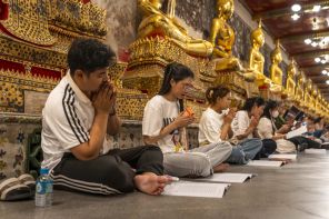 На фото: буддийские верующие сидят и молятся в храме Ват Сутхат в Бангкоке, Таиланд.