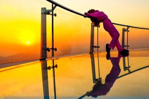 На фото: туристка позирует на «Небесном зеркале» в комплексе «Небесный город», провинция Хубэй, Китай. Объект отмечен Книгой рекордов Гиннеса как «самая большая стеклянная смотровая площадка». Расположен на высоте 520 метров над уровнем моря. «Небесное зеркало» было построено из 500 тонн стали и 1500 квадратных метров стекла. Самый большой цельный кусок стекла составляет 18 кв м.