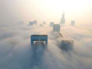 На фото: вид на небоскребы, окутанные адвективным туманом, провинция Сычуань, Китай. Адвективный туман — это тип тумана, образующийся при горизонтальном перемещении тёплого и влажного воздуха над более холодной поверхностью суши или воды. Это приводит к охлаждению воздуха и конденсации водяного пара, что снижает видимость.