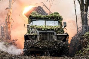 На фото: самоходная реактивная система залпового огня (РСЗО) «Град» во время боевой работы 9-й отдельной гвардейской мотострелковой бригады 51-ой гвардейской армии Южного военного округа в составе группировки войск «Центр», ДНР, Россия.
