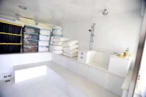 На фото: большая душевая комната, где стоят корзины с полотенцами и, по-видимому, дополнительным постельным бельем в доме с острова Литл-Сент-Джеймс, когда-то принадлежавшего покойному финансисту и осужденному за сексуальные преступления Джеффри Эпштейну.