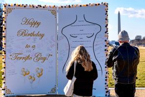 На фото: люди рассматривают протестную художественную инсталляцию, посвященную дню рождения Джеффри Эпштейна, 20 января 1953 года, на Национальной аллее в Вашингтоне, 19 января 2026 года.