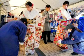 На фото: молодые люди перед церемонией в День совершеннолетия на территории крытой арены Yokohama Arena, Япония. День совершеннолетия в Японии — государственный праздник, который отмечается каждый второй понедельник января. Несмотря на то, что в Японии возраст совершеннолетия в 2022 году был снижен с 20 до 18 лет, традиционный День совершеннолетия по-прежнему отмечают те, кому исполнилось 20 лет.