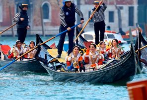 На фото: парад гондол «Праздник Марий» — один из главных водных шествий карнавала. В нем участвуют 12 молодых венецианских женщин в местных костюмах, которые плывут на лодках по Большому каналу до площади Сан-Марко. Мероприятие вдохновлено спасением дожем X века 12 невест, похищенных пиратами.