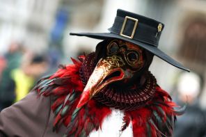 На фото: венецианскую маску в форме клюва («Доктор Чума» или Medico della Peste) создали в XVII веке как средство защиты врачей от бубонной чумы, верят историки. Длинный клюв набивали ароматическими травами, камфарой и губками с уксусом, чтобы отфильтровать «болезнетворный запах» смрадных тел и защититься от заражения воздушно-капельным путем.