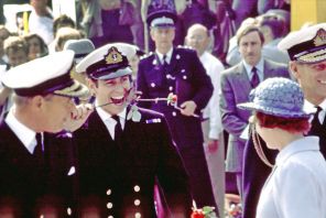На фото: британский принц Эндрю держит в зубах цветок красной розы после спуска на берег с авианосца HMS Invincible в гавани Портсмута, Англия, 17 сентября 1982 года. Королева Елизавета II и принц Филипп (справа) улыбаются, наблюдая за проделками своего сына.