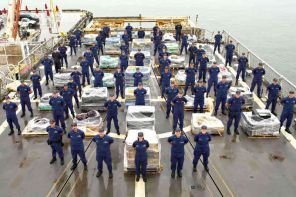 На фото: члены экипажа катера Береговой охраны США «Бертольф» выгружают 14 тонн кокаина, перехваченного в восточной части Тихого океана, 2016 год.