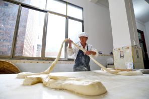 Глухой стук… Мастер многократно растягивает, складывает и перекручивает тесто, ударяя его о поверхность стола. С небольшим усилием лапша превращается в длинные тонкие полоски — так рождается обычная лапша.