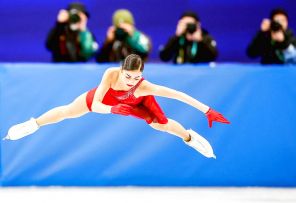 На фото: Аделия Петросян (Россия) во время соревнований, Италия, Милан. Ледовая арена «Милано». Фигурное катание. Женщины. Произвольная программа.