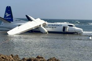 На фото: на месте происшествия. Гражданский самолет совершил жесткую посадку на побережье Индийского океана вскоре после вылета из международного аэропорта сомалийской столицы Могадишо. Вскоре после взлета возникла техническая неисправность (по некоторым данным — отказ двигателя). Командир принял решение о возврате, но при посадке самолет выкатился за пределы ВПП, протаранил ограждение и оказался на мелководье. Последствия: Пострадавших нет. Самолет получил разрушения, включая повреждение крыла.