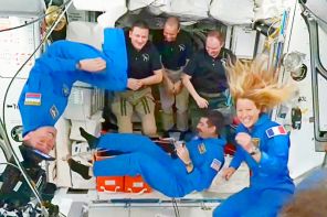 На фото: экипаж американского космического корабля Crew Dragon компании SpaceX прибыл на МКС: космонавт Роскосмоса Андрей Федяев (слева), астронавт NASA Джек Хэтэуэй (в центре) и астронавт Европейского космического агентства Софи Адено (справа).