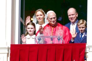 На фото: принцесса Габриэлла, княгиня Монако Шарлен, Папа Римский Лев XIV, князь Монако Альбер II и принц Жак (слева направо) приветствуют верующих с балкона Княжеского дворца в Монако.