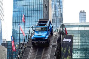На фото: автомобиль Jeep преодолевает полосу препятствий в Camp Jeep, внедорожном приключении, позволяющем пассажирам прокатиться с профессиональными водителями по крутым препятствиям, таким как 9-метровая (40-градусная) «гора Jeep», во время медиа-дня Нью-Йоркского автосалона в конференц-центре имени Джейкоба К. Джавитса в Нью-Йорке.